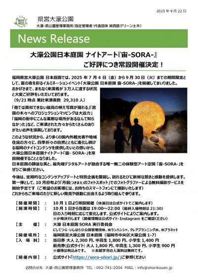 このような状況から、より多くの国内外観光客や地域住民の方々に、四季折々の自然とともに進化し続ける福岡のナイトコンテンツを提供したいとの想いから、大濠公園日本庭園ナイトアート「宙- SORA-」を常設開催することとなりました。