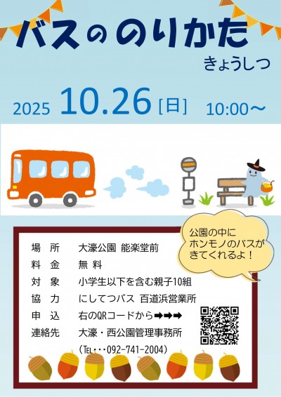 2025年10月02日イベント【満員御礼】○バスの乗り方教室開催のお知らせ○いつも大濠公園をご利用いただきありがとうございます。 キャンセル待ちを含め、満員となりましたので受付を終了させていただきます。 ご参加の皆様、当日大濠公園能楽堂前でお待ちしております。2025busschool.pdf