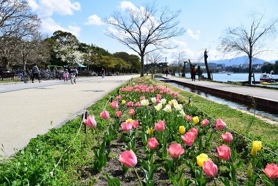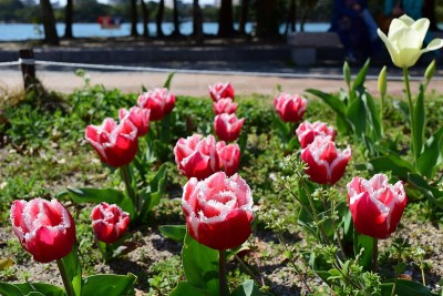 池の周りの花壇で、昨年の秋にみんなで植えたチューリップが咲き始めています。