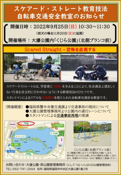 2022年09月01日イベント自転車交通安全教室「スケアード・ストレート」のお知らせ秋の全国交通安全運動週間(9月21日~30日)に合わせ、 「スケアードストレート(*詳細はチラシをご覧ください)教育技法」を取り入れた自転車交通安全教室を開催します。 大濠公園では初の試みです! 場所はくじら公園で行い、見学無料です。 スタントマンによる実演を間近でご覧いただき、交通安全について改めて考えてみませんか?関連サイト