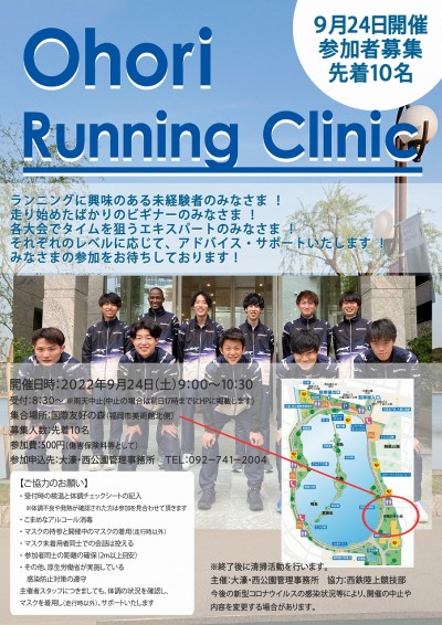 2022年09月08日イベントランニングクリニック開催のお知らせコロナ禍で複数回中止していたランニングクリニックが復活します! 西鉄陸上競技部にご協力いただき、一度自分のフォーム等確認してみませんか? 今からランニングを始めようという方も大歓迎! 屋外ではありますが、蜜を避けるため募集人数を絞っております。 予約制先着順のため、お早めの申し込みをお待ちしております! ※詳細はチラシをご覧ください。関連サイト
