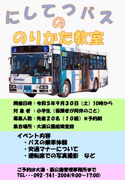 2023年09月11日イベント○バスの乗り方教室開催のお知らせ○大濠公園ににしてつの路線バスが来ます! 小学生の皆さん、バス乗ったことがない子も「乗り方体験」してみませんか? 日時:2023年9月30日(土)10時~ 対象:小学生とその保護者の方 参加費:無料 開催場所:大濠公園能楽堂前 ※先着予約制となっております。 ご予約は 大濠公園管理事務所(TEL:092-741-2004/受付時間:9:00~17:00)まで。 普段乗れない運転席に座って記念撮影も予定しています。 ご予約お待ちしています。
