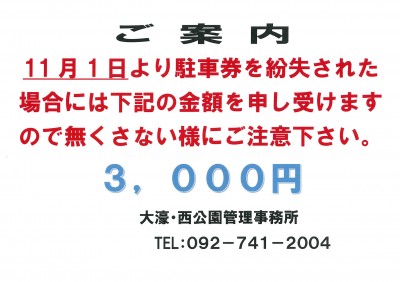 2023年10月16日お知らせ大濠公園駐車場をご利用の方へ(駐車券紛失時の対応)いつも大濠公園をご利用いただきありがとうございます。 2023年11月1日より、「駐車券」を紛失された場合の対応が変わります。 駐車場ご利用の方は「駐車券」を紛失されませんようご注意ください。 なお、午後11時以降の出庫は対応出来かねます。 日付をまたいでの駐車もご遠慮ください。 ご協力をお願いいたします。