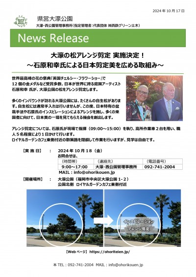 世界最高峰の花の祭典『英国チェルシー・フラワーショー』で12個の金メダルなど受賞多数、日本が世界に誇る庭園アーティスト石原和幸 氏が、大濠公園の松をアレンジ剪定します。