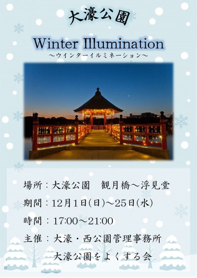 2024年11月26日お知らせウィンターイルミネーションについて今年も大濠公園の北側、観月橋~浮見堂をライトアップします。 期間:12月1日(日)~12月25日(水) 時間:17:00~21:00 水面に映る、幻想的なライトアップを今年もお楽しみください。