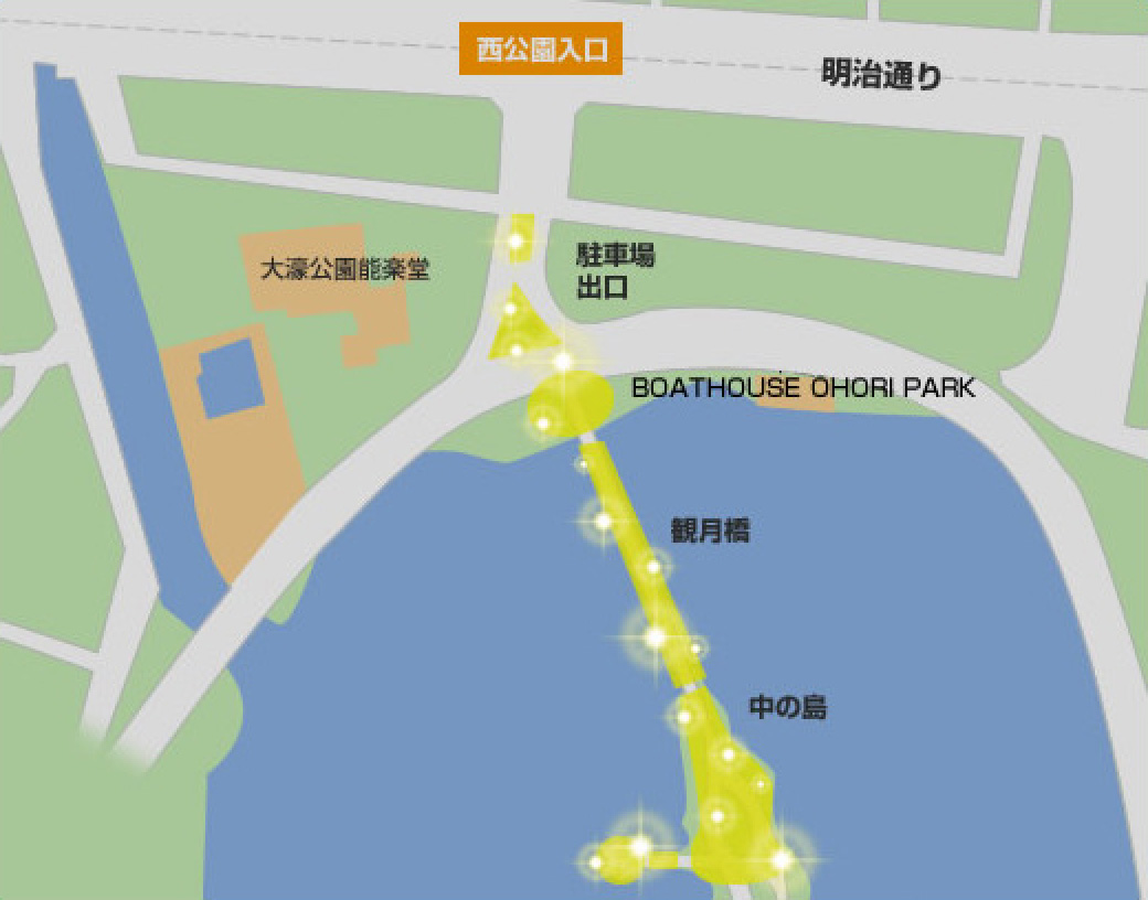 (大濠公園北側、中央口〜観月橋〜中の島浮見堂付近)